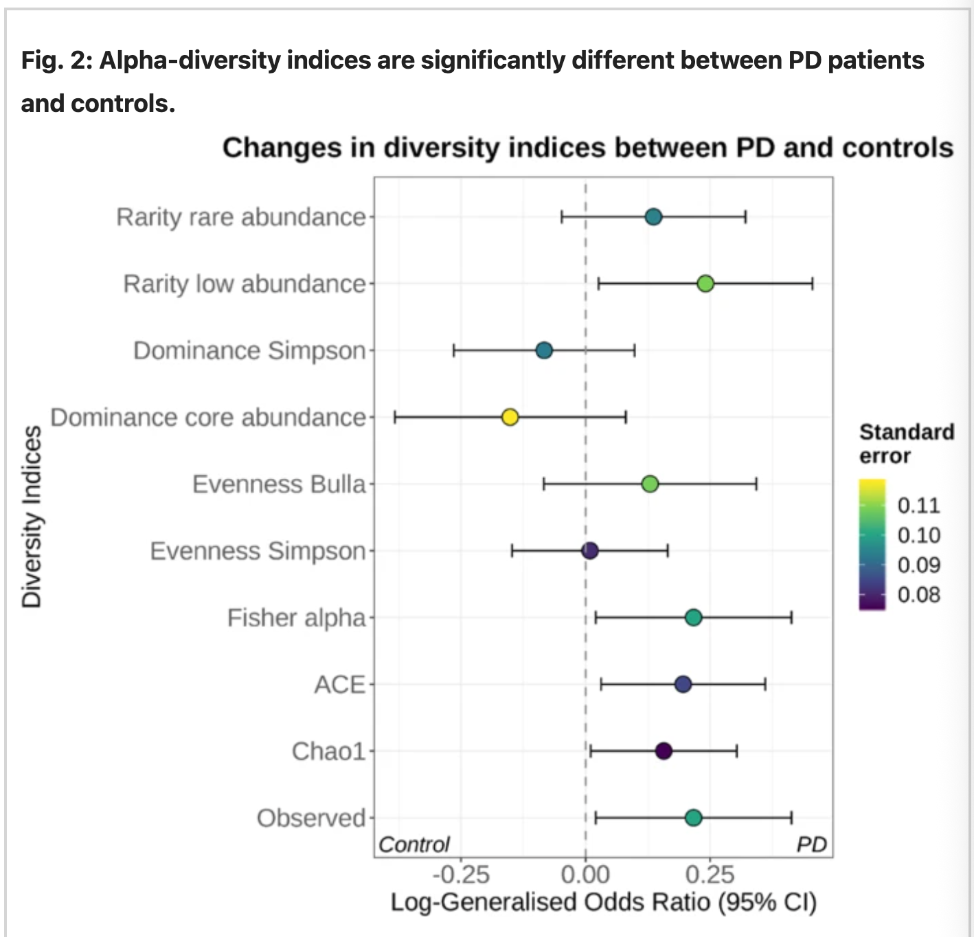 The species level for each dataset was combined using random-effect-meta-analysis. The abundance scale was determined using the observed number of species and the indices Chao1, ACE, and Fisher’s alpha. The figure above indicates the presence of rare genre bacteria to be present abundantly in PD samples than control.