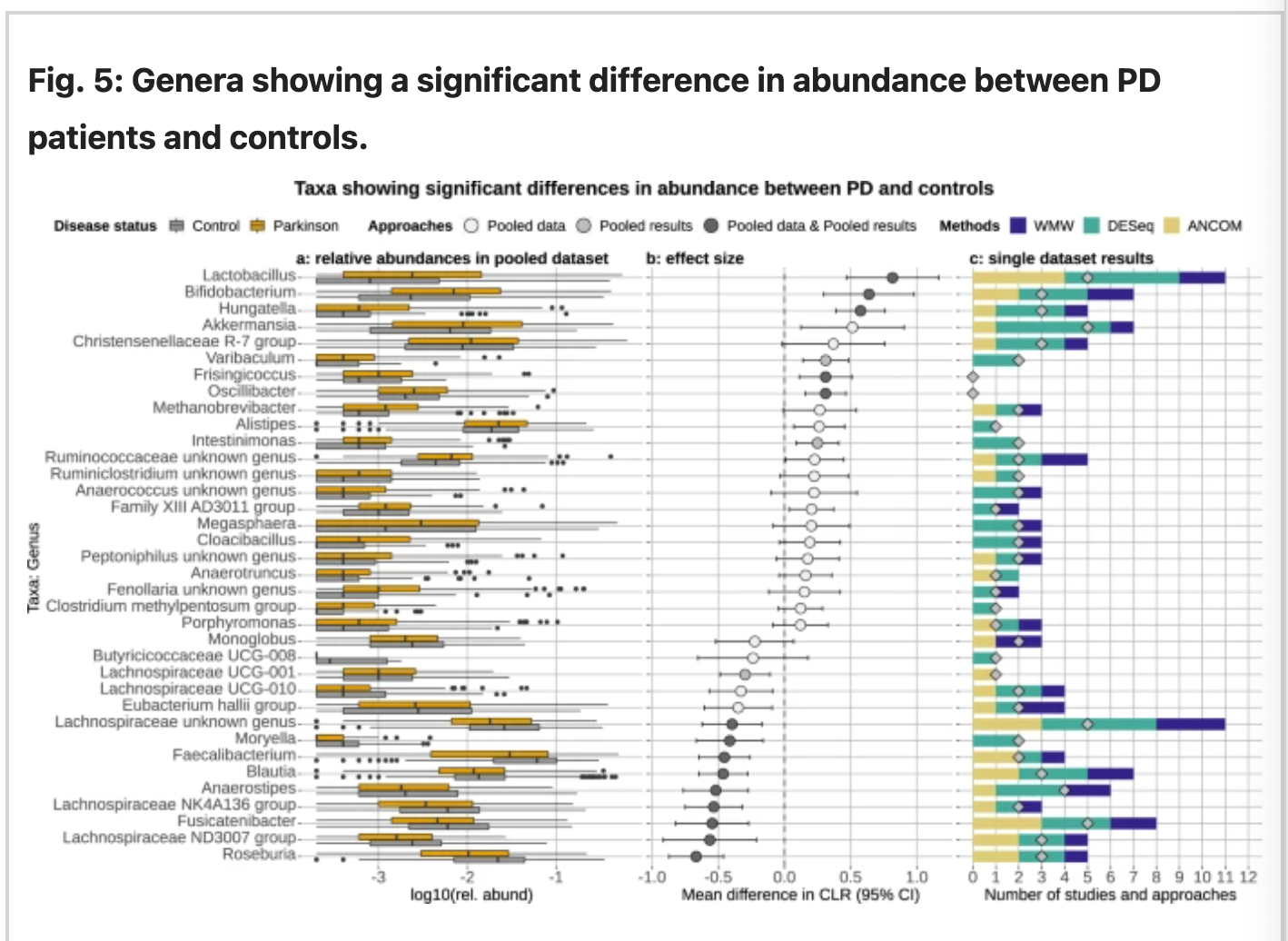 **Romano, S., Savva, G. M., Bedarf, J. R., Charles, I. G., Hildebrand, F., & Narbad, A. (2021). Meta-analysis of the Parkinson’s disease gut microbiome suggests alterations linked to intestinal inflammation. Npj Parkinson’s Disease, 7(1), 1–13. https://doi.org/10.1038/s41531-021-00156-z