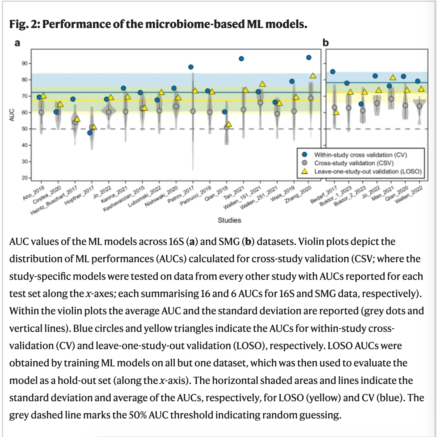 In comprehensive analysis of datasets used in these models and studies were derived from 16S and SMG. The in-vivo data used in the models are limited with 4489 data being the highest pool of dataset ever used. The ML model accuracy was severely depleted due to limited cross-compatibility of the datasets. The novel models created for the metagenomic studies using LOSO validation, CV, CSV are crucial developments to improve the accuracy and model practicality of the models. This helps the novel models to cross-validates its accuracies through datasets from various independent studies. LOSO in particular, generalizes the datasets filtering out the study based biases before being fetched into the model.